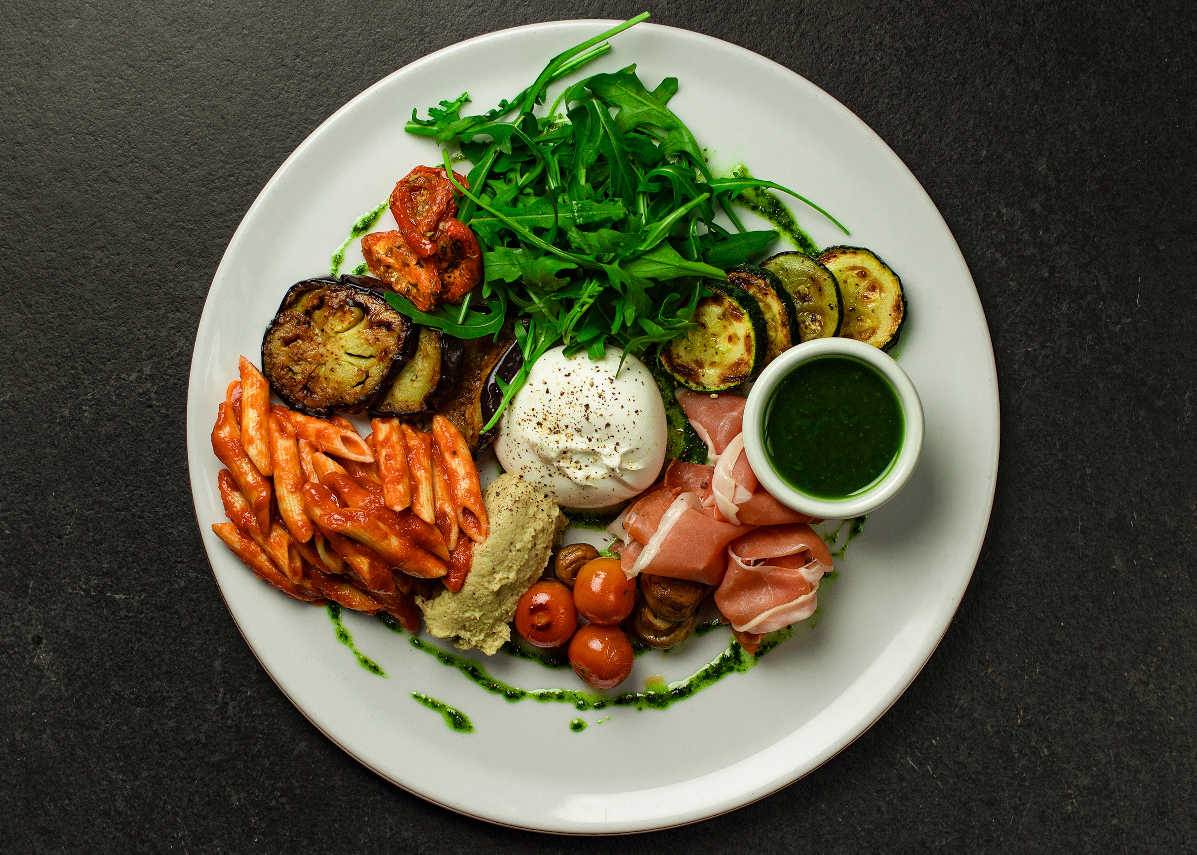 Burrata, jambon de parme, légumes grillés, penne à la tomate, caviar d’aubergine, pesto & roquette