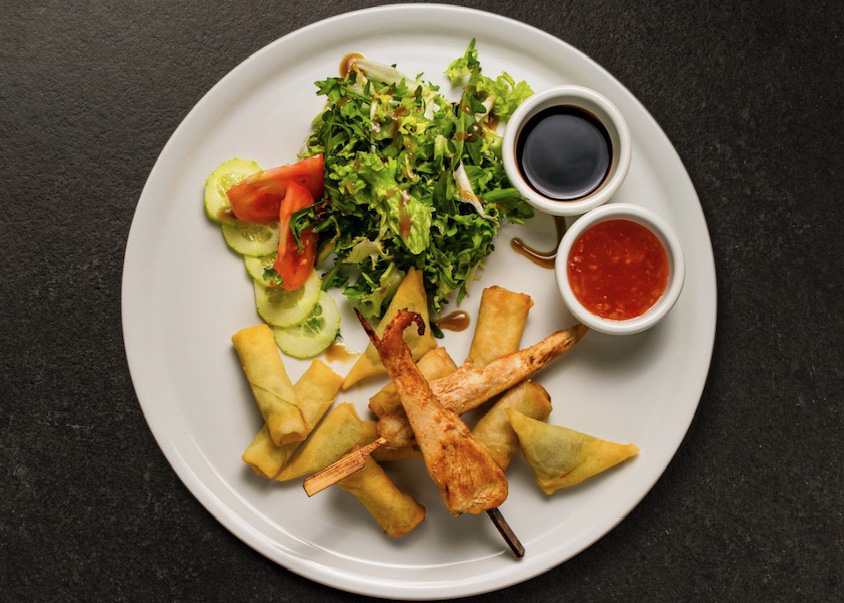 Assortiment asiatique: nems, loumpias, rouleaux de printemps, brochette de poulet mariné