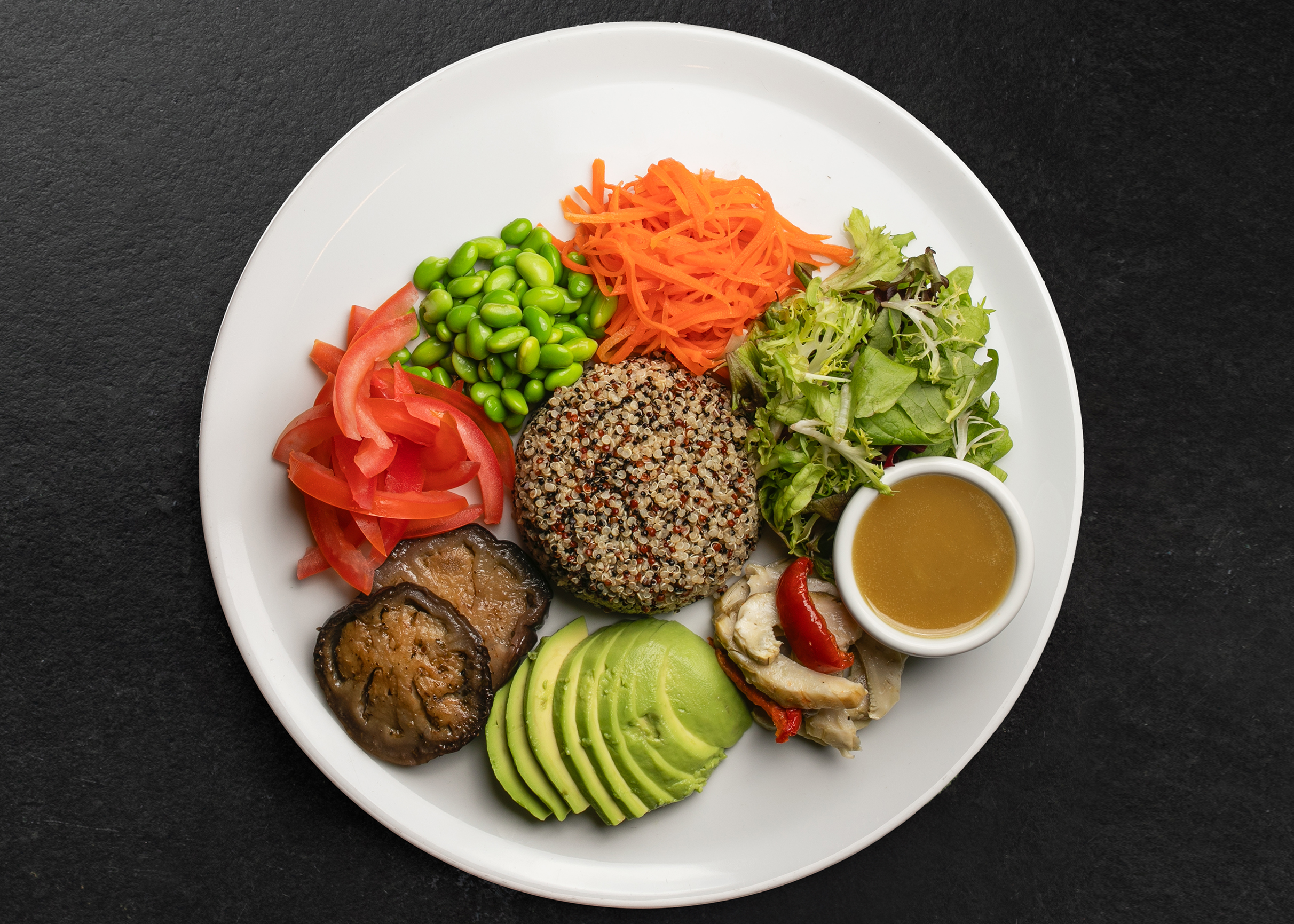 Emincé d’artichaut, edamame, carotte râpée, julienne de tomate, demi-avocat, quinoa tricolore, aubergine marinée, tomate confite, salade et vinaigrette