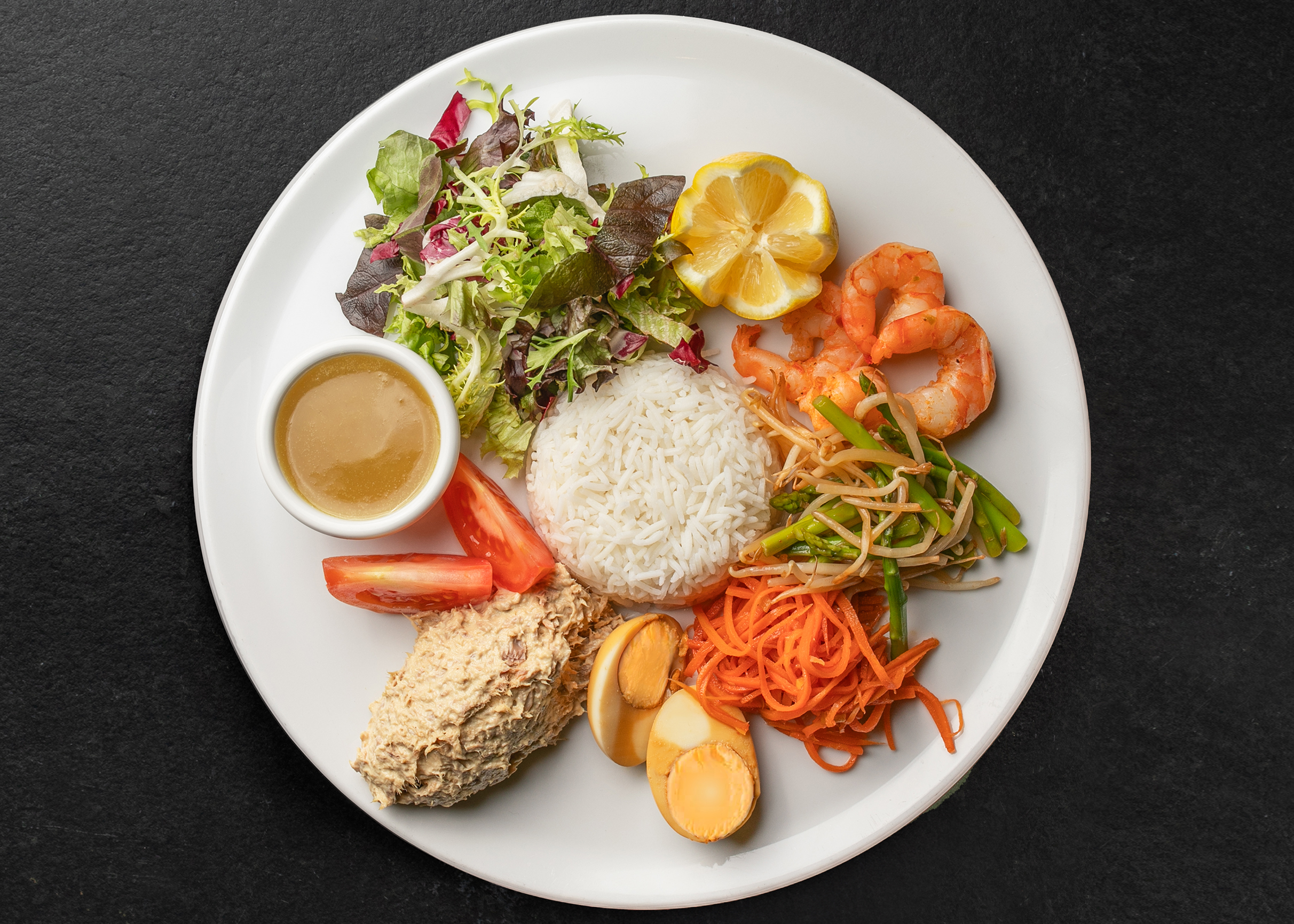 Thon au wasabi, scampis, œuf dur au kikkoman, riz, salade mixte (asperge thaï, soja et carotte) façon thaïe, tomate, salade et vinaigrette.