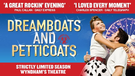 This show was inspired by the unexpectedly huge sales of a CD issued by Universal Music, aimed at the nostalgia market. The first “Dreamboats and Petticoats” CD sold over two million copies and led to the creation of a stage show which began a five month UK tour in Bromley in February 2009. The success of the tour led to its West End debut, as a seven-week filler. After a three month gap, the show was re-created at the Playhouse Theatre in January 2010 and is still running at the start of 2012. At the same time a second UK tour played throughout 2010, much of 2011 and is planned to run through 2012.Presse : LYN GARDNER for THE GUARDIAN says, " Inoffensive and as squeaky clean as a toothpaste advert, this musical trip down memory lane was inspired by a compilation album of early 1960s hits...Dreamboats and Petticoats is not bad, although it tails off lamely in the second half, but it is not very good either."