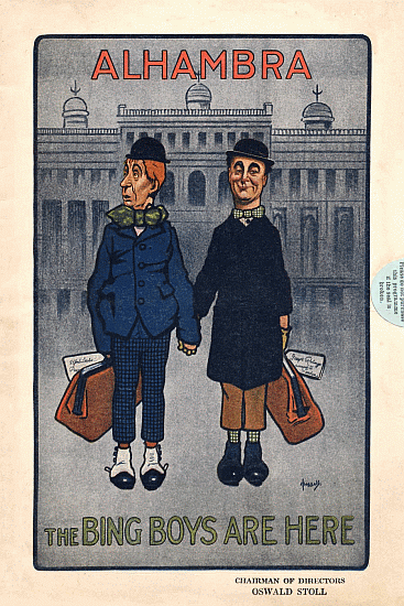 The Bing Boys Are Here, intitulé « A Picture of London Life, in a Prologue and Six Panels », est la première d’une série de revues qui ont été jouées à l’Alhambra Theatre de Londres pendant les deux dernières années de la Première Guerre mondiale. La série comprenait The Bing Boys on Broadway et The Bing Girls Are There. La musique a été écrite par Nat D. Ayer avec des paroles de Clifford Grey, et le texte a été écrit par George Grossmith, Jr. et Fred Thompson d’après Le Fils Touffe de Rip et Bousquet. Eustace Ponsonby, Philip Braham et Ivor Novello ont particip à cette création.