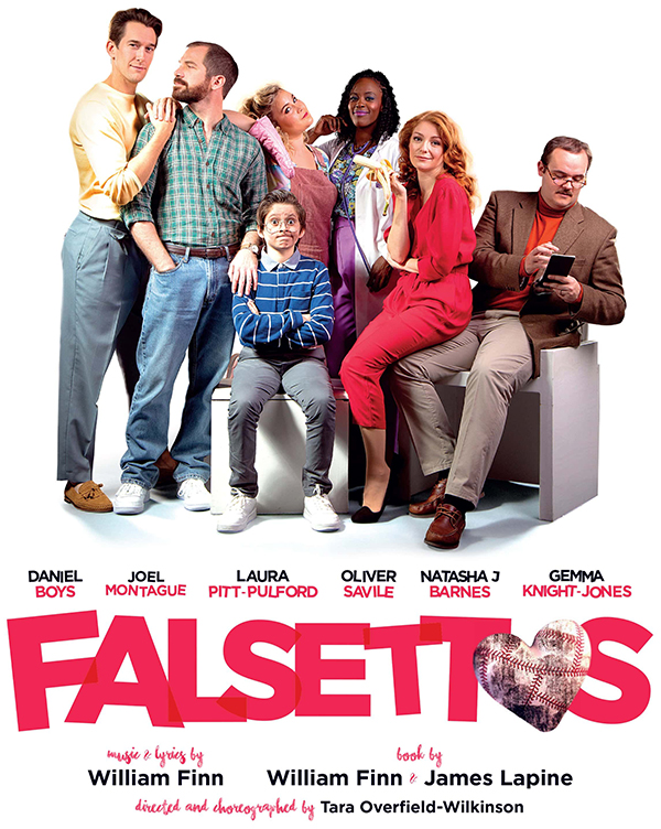 Dernière: 23 November 2019Mise en scène : Tara Overfield-Wilkinson • Chorégraphie : Tara Overfield-Wilkinson • Producteur : Star(s) : Avec: Natasha J Barnes, Daniel Boys, Gemma Knight-Jones, Joel Montague, Laura Pitt-Pulford, Oliver Savile, Albert Atack, George Kennedy, Elliot Morris and James Williams.Commentaires : Falsettos receive its European premiere at The Other Palace in August 2019.