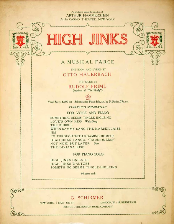Après le succès de The Firefly (1912), Friml consolide sa réputation avec High Jinks, qui s'inscrit dans une veine plus légère et comique. L'œuvre se rapproche du style des opérettes viennoises. L'opérette a été produite par Arthur Hammerstein, qui misait sur Friml pour rivaliser avec Victor Herbert, alors le maître du genre aux États-Unis.