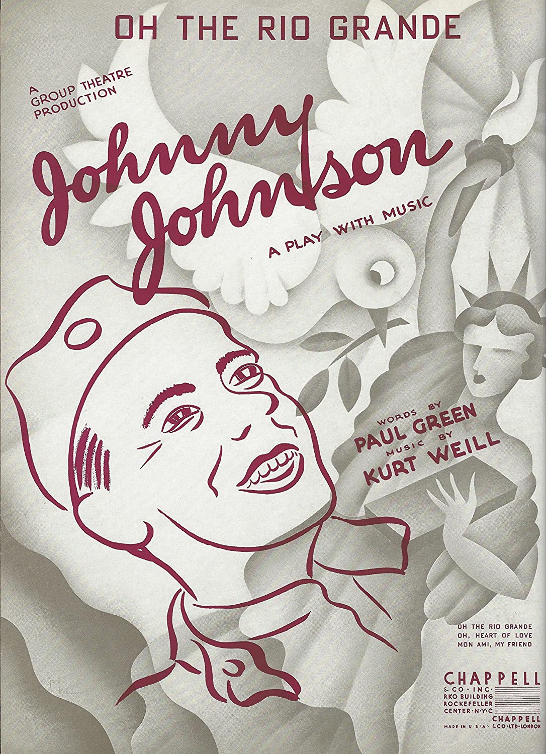 La diatribe contre la guerre Johnny Johnson est la première partition écrite directement pour Broadway par Kurt Weill (Die Dreigroschenoper - The Threepenny Opera - L'Opéra de quat'sous ()) avait été créée en Allemagne en 1928). La pièce de Paul Green avec la musique de Kurt Weill était tout sauf traditionnelle. Elle a proposé une variété de méthodes pour incorporer la musique dans une intrigue un peu picaresque parsemée de techniques de mise en scène expressionnistes et brechtiennes. Il y avait des numéros de comédie musicale à l’ancienne, des chansons avec de brèves bribes de paroles, des séquences orchestrales qui fonctionnaient comme de la musique de fond et des numéros interprétés par des chanteurs hors scène. Le personnage-titre (joué par Russell Collins) chantait à peine, tandis que d’autres avaient une chanson avant de disparaître de l’histoire!