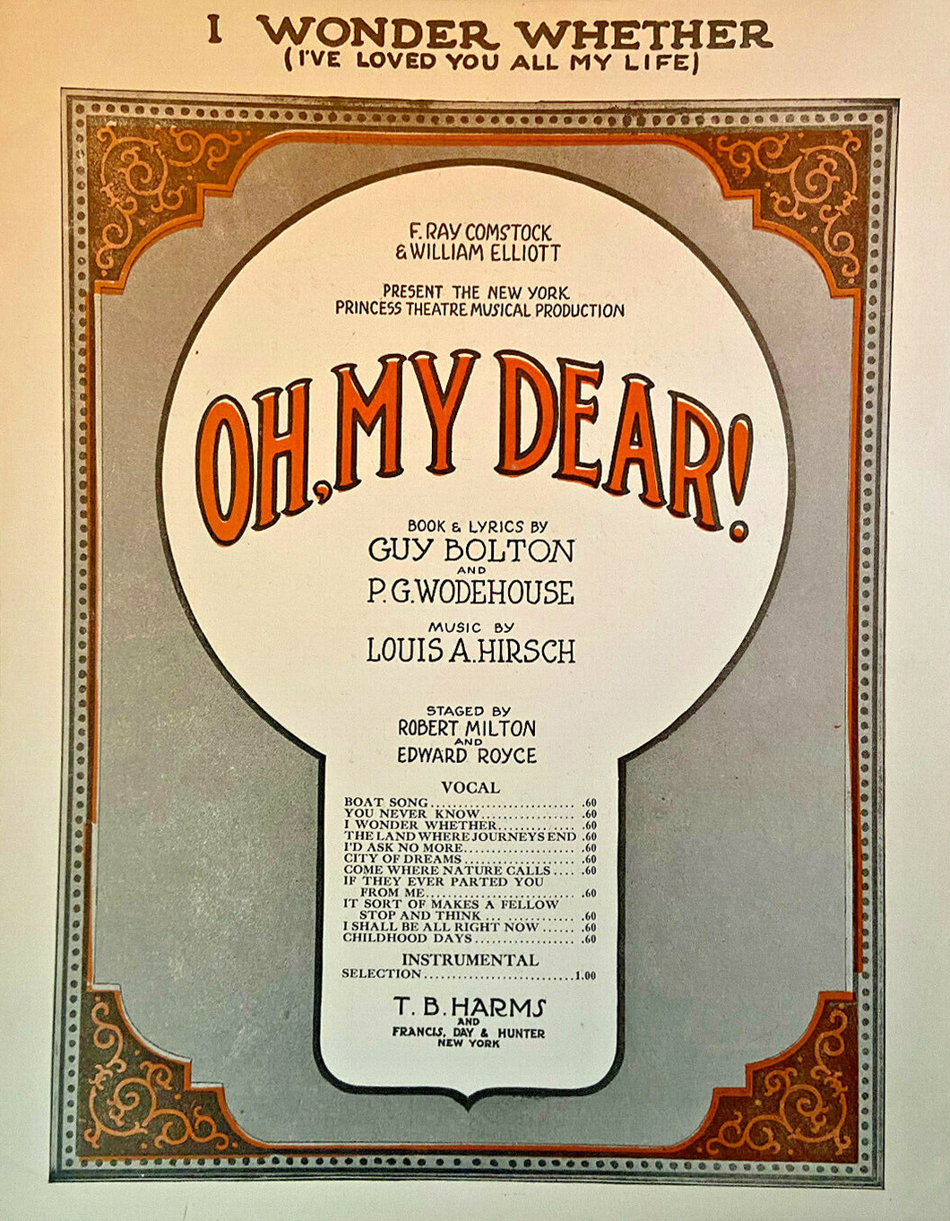 Après leurs magnifiques succès qualifiés de "The Princess Theatre Musicals", Guy Bolton et P. G. Wodehouse sont revenus à Broadway avec le spectacle "Oh, My Dear!", mais Jerome Kern ne faisait pas partie du nouveau projet et Louis A. Hirsch en était le compositeur. Kern a cependant composé une chanson, « Go, Little Boat » alias « Boat Song ». Les critiques ont trouvé que cette œuvre n'avait pas le même niveau que les autres de la série du Princess Theatre, mais le musical a tenu près de deux cents représentations à New York avant de faire le tour du pays dans une nouvelle version post-Broadway.