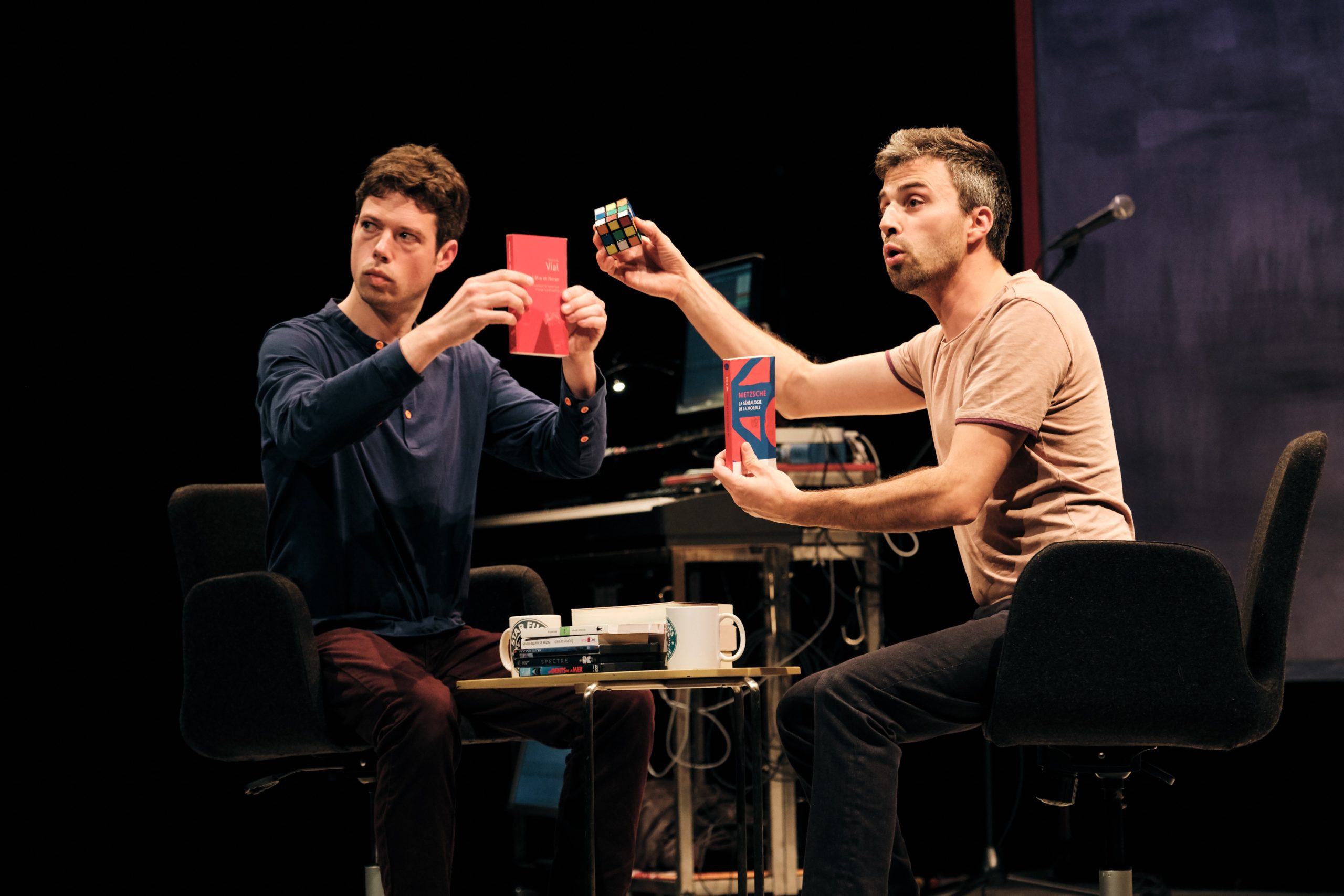 Les deux trentenaires se connaissent depuis l’âge du lycée, et se présentent. Pierre est comédien, metteur en scène, musicien, musicologue, romancier. Manu est metteur en scène, acteur, philosophe, chanteur ("non, forme en philosophie, et chanteur de karaoké, mais soit"). Ils ont mis leurs compétences en commun pour cet opus de leur compagnie Maps. Ensemble ils ont mené l'enquête et relèvent le défi qu'ils se sont donné: la synthétiser sur scène. Avec la complicité, entre autres, de Clément Papin a la création des lumières, de Marie-Christine Meunier à la scénographie, de Milena Kipfmüller à la dramaturgie sonore. Car Pourquoi Jessica a-t-elle quitte Brandon? est bien sur une œuvre collective.