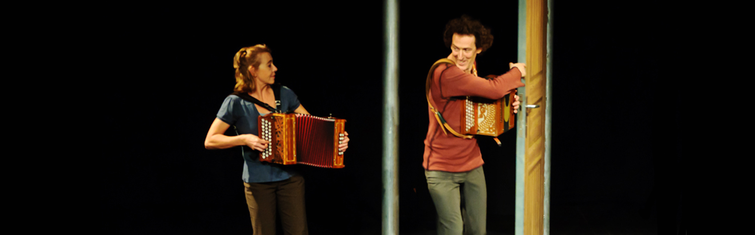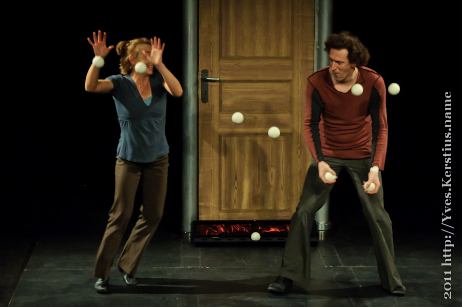 Un duo à trois : un homme, une femme et… une porte. Une porte, qu’ils s’amusent à faire tourner, virevolter, balancer, claquer… Une porte qu’ils ouvrent sur leur univers, où le mouvement devient poésie. À travers un mélange de musique, de danse et de jonglerie, les deux acrobates évoquent la vie d’un couple au quotidien, faite de situations familières, de gestes précis, ponctués de rebonds discrets, d’humour, de mouvements souples et habiles. De ce ballet surréaliste éclot un langage sans paroles, subtil et original, qui raconte une histoire tendre, joyeuse et d’une très grande humanité. Un véritable concentré de bonheur !
