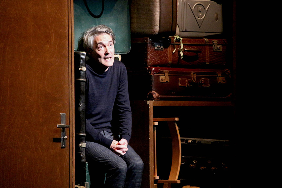 Sur scène, des valises que le comédien ouvre pour interpréter les différents personnages