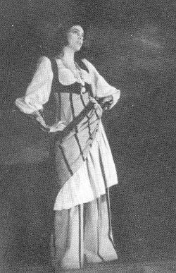Multipliant les efforts pour se vieillir, la comédienne incarne une duègne entremetteuse, faussement dévote, dans RUY BLAS, de Victor Hugo (Théâtre National, saison 1947-48). La basquine qu'elle porte, malgré qu' elle soit sévère et sombre, camoufle mal sa jeunesse! Le règne des rides et des faux nez a commencé pour elle, en même temps que la plus impitoyable des écoles de théâtre: celle des compositions. On sait qu'elle y excellera.