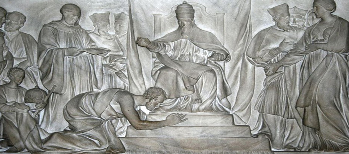 Mais tout va se compliquer avec l’élection en 1073 de Grégoire VII comme nouveau pape. En 1075, il va commencer par promulguer le «Dictatus papae» qui affirme les pouvoirs du pape. La plupart des évêques d'Allemagne et de Lombardie entrent alors en dissidence avec le pape qu'ils reconnaissaient jusqu'alors, et déclarent le pape Grégoire VII destitué. Les évêques et les archevêques se considèrent en effet comme des princes de l'Empire, dotés de privilèges importants fournis par l’Empereur. En 1076, la réponse de Grégoire VII va être très claire: il déchoit l’Empereur Henry IV de son titre de Roi d’Italie et va jusqu’à l’excommunier! Cette fois, après cette excommunication, beaucoup de princes allemands qui soutenaient auparavant Henri, se détachent de lui; ils le contraignent à se séparer de ses conseillers que le pape avait condamnés et le forcent à «faire pénitence avant le terme d'un an et un jour». Ils veulent que Henry IV se soumette au jugement du pape sinon ils éliront un nouveau souverain.
