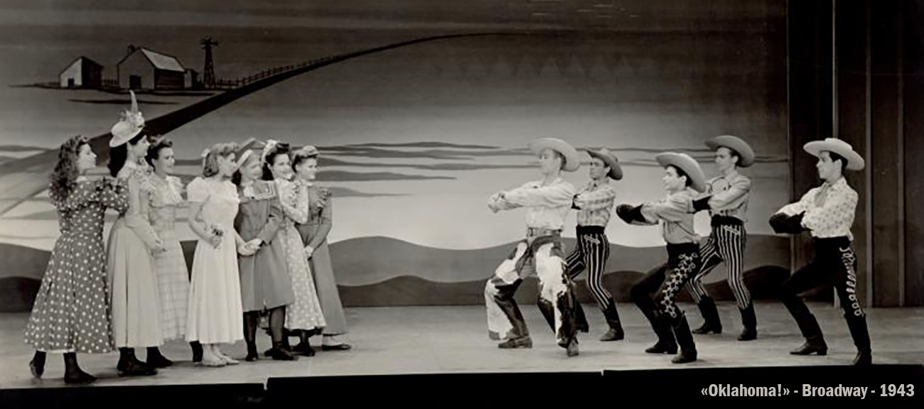En 1943, Richard Rodgers et Oscar Hammerstein II offrent à la comédie musicale son premier grand succès populaire, Oklahoma !, créé le 31 mars au St. James Theater de New York. Ancrée dans l'Amérique profonde, l'œuvre, qui restera plus de cinq années consécutives à l'affiche, mêle thèmes sentimentaux et historiques ; les ballets révolutionnaires de la chorégraphe Agnes De Mille ne sont plus simplement des interludes divertissants mais constituent des moments clés du récit. Seules douze chansons sont composées ; néanmoins, leurs reprises avec de nouvelles paroles par d'autres personnages ajoutent de l'épaisseur à la narration.