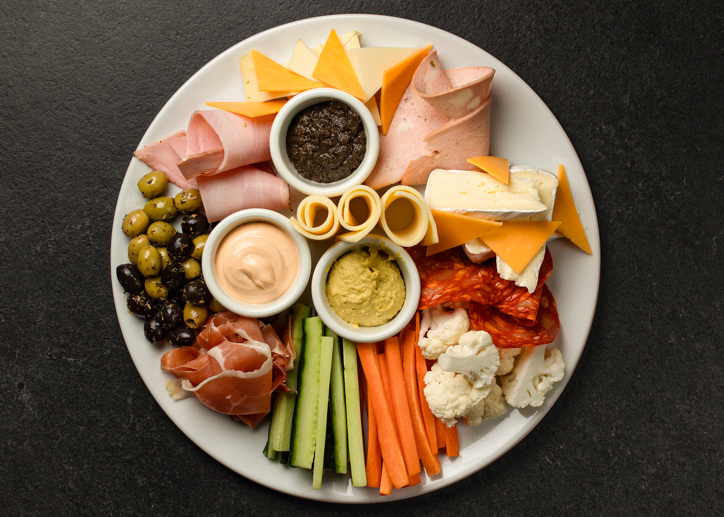 Burrata, jambon de parme, légumes grillés, penne à la tomate, caviar d’aubergine, pesto & roquette