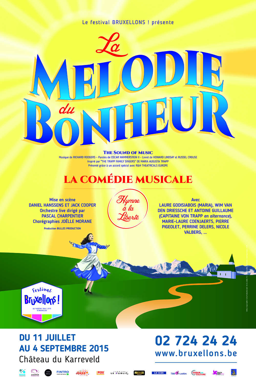 Type de série: RevivalThéâtre: Festival Bruxellons! (Bruxelles - Belgique) Salle : La CourDurée : 1 mois 3 semaines Nombre : 25 représentationsPremière Preview : Saturday 11 July 2015Première : Tuesday 14 July 2015Dernière : Tuesday 08 September 2015Mise en scène : Daniel Hanssens • Jack Cooper • Chorégraphie : Producteur : Avec : Laure Godisiabois (Maria), Wim van den Driessche (Capitaine von Trapp), Marie-Laure Coenjaerts (La Mère Supérieure), Pierre Pigeolet (Max Detweiler), Perrine Delers (Baronne Elsa Schraeder), Nicole Valberg (Mme Schmidt, la gouvernante), Roland Bekkers (Franz, le majordome), Damien Locqueneux (Rolf Grüber), Maud Hanssens (Liesl von Trapp), Estaban Brouillard (Friedrich von Trapp), Clara Barlow (Louisa von Trapp), Nicolas Djuroski (Kurt von Trapp (en alternance)), Sylvain Schmitt (Kurt von Trapp (en alternance)), Joëlle Massart (Brigitta von Trapp (en alternance)), Adélaïde Couplet (Brigitta von Trapp (en alternance)), Clémentine Guyot (Marta von Trapp (en alternance)), Noéline Siméons (Marta von Trapp (en alternance)), Ivy Barlow (Gretl von Trapp (en alternance)), Camille Barreira (Gretl von Trapp (en alternance)), Shérine Seyad (Sœur Margaretta), Sarah Delforge (Sœur Sophie), Jolijn Antonissen (Sœur Berthe), Marcel Bergez (Amiral von Schreiber), Jean-Claude Gerard (Baron Elberfeld), Anne Vrielinck (Baronne Eberfeld), Bruno Mullenaerts (Herr Zeller), Emilie Debu (Ensemble), Alice Lopez (Ensemble), Aline Massinon (Ensemble), Catherine Gallez (Ensemble), Mehdi Loumrhari (Ensemble), Raphaël Bocken (Ensemble), Stéphane Rimbert (Ensemble), Arnaud Delforge (Ensemble), Vincent David (Ensemble)