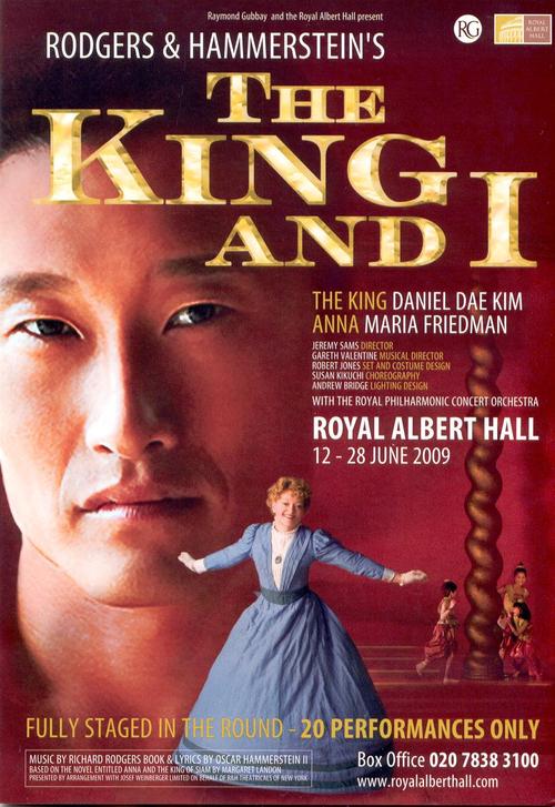 Type de série: RevivalThéâtre: Royal Albert Hall (Londres - Angleterre) Durée : 2 semaines Nombre : Première Preview : Friday 12 June 2009Première : Saturday 13 June 2009Dernière : Sunday 28 June 2009Mise en scène : Jeremy Sams • Chorégraphie : Jerome Robbins • Producteur : Avec : Maria Friedman (Anna), Daniel Dae Kim (King), Jee Hyun Lim (Lady Thiang), Yanle Zhong (Tuptim), Ethan Le Phong (Lun Tha), Michael Simkins (Sir Edward), David Yip (Kralahome), Stephen Scott, Miwa Saeki, Azumi Ono, Victoria Sahakian Rogers, Yo Santhaveesuk Ho YiCommentaires : This was a huge spectacular production with a cast of 45 adults and 77 children, and the 40-strong Royal Philharmonic Orchestra, not to mention the impressive (indoor!) fireworks display. There was special praise for Maria Friedman and for Daniel Dae Kim (better known from the cult TV series “Lost”).