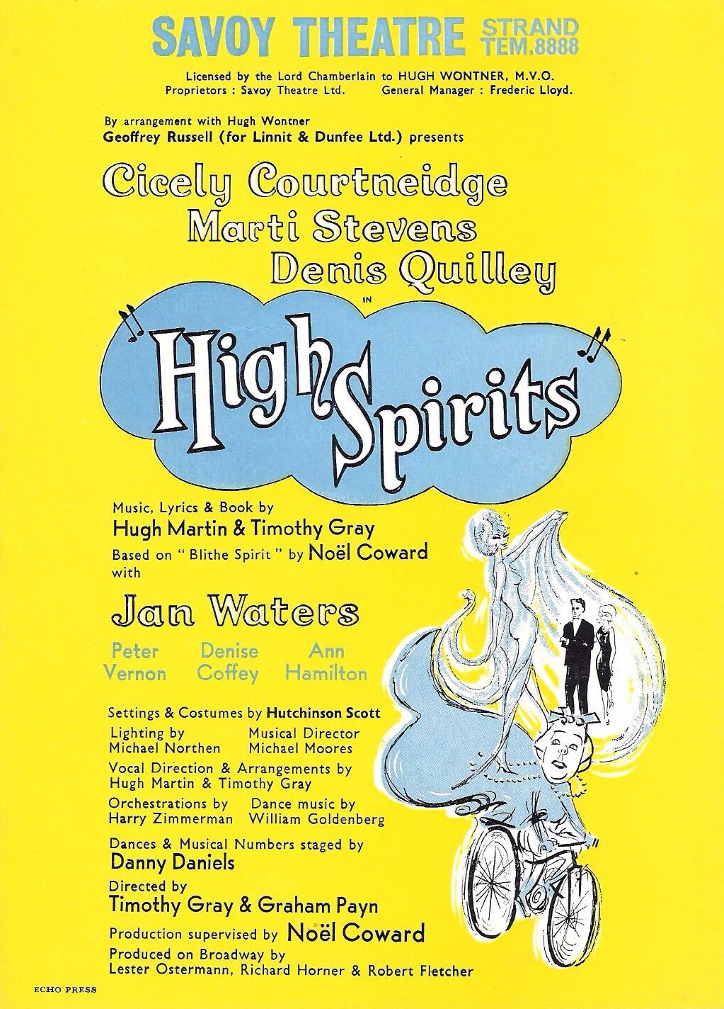 Type de série: Original LondonThéâtre: Savoy Theatre (Londres - Angleterre) Durée : 2 mois 3 semaines Nombre : 1 previews - 94 représentationsPremière Preview : Monday 02 November 1964Première : Tuesday 03 November 1964Dernière : Saturday 23 January 1965Mise en scène : Noël Coward • Hugh Martin • Timothy Gray • Chorégraphie : Producteur : Avec : Cicely Courtneidge (Madam Arcati), Denis Quilley (Charles Condomine), Jan Waters (Ruth), Marti Stevens (Elvira)
