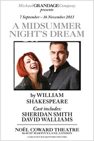 Dernière: 16 November 2013Mise en scène : Michael Grandage • Chorégraphie : Producteur : Star(s) : Avec: Sheridan Smith (Titania), David Walliams (Bottom), Susannah Fielding (Hermia), Katherine Kingsley (Helena), Stefan Adegbola (Robin Starveling/Cobweb), Stefano Braschi (Demetrius), Padraic Delaney (Oberon/Theseus), Richard Dempsey (Peter Quince/Moth), Henry Everett (Tom Snout/Peaseblossom), Gavin Fowler (Puck/Philostrate), Alex Large (Francis Flute/Mustardseed), Sam Swainsbury (Lysander), Craig Vye (Snug the Joiner/First Fairy), Leo Wringer (Egeus)Presse : "The production – the penultimate in the Grandage Company's season at the Noel Coward Theatre – is, in the final analysis, a bit too tame, despite the hippies, to release the full wondrously disruptive power of the dream world or reverberate with the after-tremors of its transforming experience. It's undeniably attractive but the spell it casts is not deep."