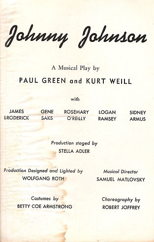 La diatribe contre la guerre Johnny Johnson est la première partition écrite directement pour Broadway par Kurt Weill (Die Dreigroschenoper - The Threepenny Opera - L'Opéra de quat'sous ()) avait été créée en Allemagne en 1928). La pièce de Paul Green avec la musique de Kurt Weill était tout sauf traditionnelle. Elle a proposé une variété de méthodes pour incorporer la musique dans une intrigue un peu picaresque parsemée de techniques de mise en scène expressionnistes et brechtiennes. Il y avait des numéros de comédie musicale à l’ancienne, des chansons avec de brèves bribes de paroles, des séquences orchestrales qui fonctionnaient comme de la musique de fond et des numéros interprétés par des chanteurs hors scène. Le personnage-titre (joué par Russell Collins) chantait à peine, tandis que d’autres avaient une chanson avant de disparaître de l’histoire!