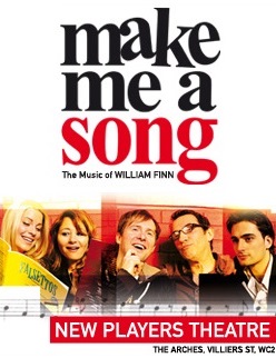 Dernière: 06 April 2008Mise en scène : Andrew McBean • Chorégraphie : Producteur : Star(s) : Avec: Sally Ann Triplett, Louise Dearman, Frances Ruffelle, Gareth Snook, Simon Thomas, Ian H WatkinsCommentaires : “Make Me a Song” originally played off-Broadway for 54 performances in November 2007. Nearly 30 songs were woven together to tell personal, haunting and often hilarious tales from Finn’s rich and touching human songbook, and with a superb cast of top West End performers, this London production was highly praised by the critics.