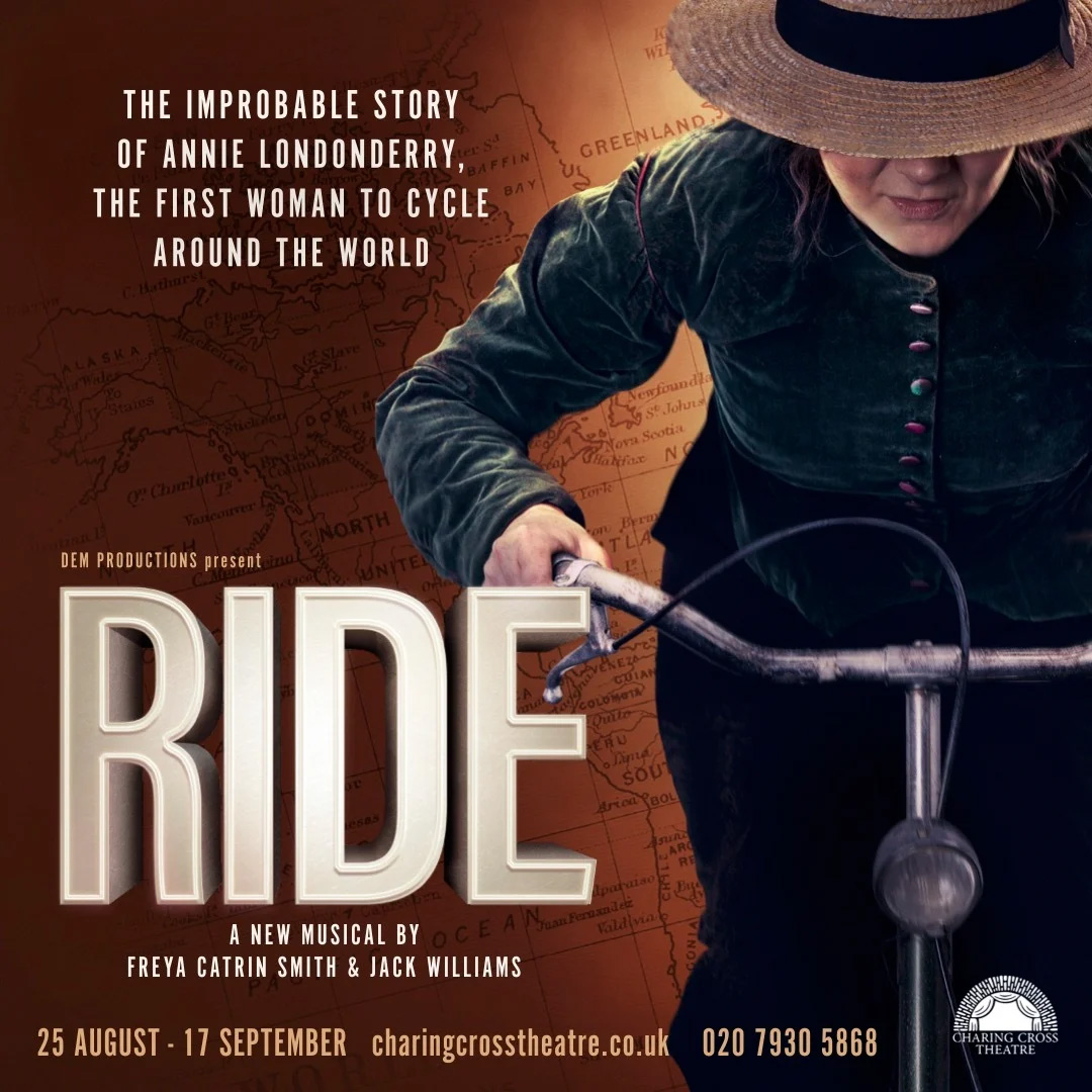 After its premiere at Vault Festival in 2020, Ride staged two performances at the Garrick Theatre in June 2021. It was presented as a semi-staged "public workshop production," sometimes with script in hand. The cast featured Gemma Sutton (Cilla) as Annie and Bronté Barbé (Call The Midwife) as Annie's secretary, Martha.