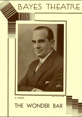 "The Wonder Bar" était une « nouveauté continentale de la vie nocturne européenne » qui se déroulait au Wonder Bar, une discothèque parisienne appartenant à Monsieur Al (Jolson). Pour l’occasion, le (Nora) Bayes Theatre a été transformé en une boîte de nuit rouge, noir et or où le public du théâtre se retrouvait assis à table et pouvait même danser sur la scène avant le début de chaque représentation (une note dans le programme annonçait qu’il y avait des danses sur la scène avant le début de la pièce et que les membres du public étaient cordialement invités à y participer). Situé au-dessus du Weber & Fields Music Hall (plus tard le 44th Street Theatre), le Bayes était à l’origine connu sous le nom de Lew Fields’ 44th Street Roof Garden. Pour "The Wonder Bar", la scène du Bayes a été reconfigurée de sorte qu’elle s’est étendue jusque dans l’auditorium et a ainsi supprimé la séparation entre la scène et la salle (avec ses tables et chaises au lieu de sièges de théâtre réguliers) dans un espace unique qui a créé l’illusion d’une grande discothèque. Incidemment, une note de programme indiquait que « les adaptateurs remercient M. George Jessel pour ses suggestions utiles ».