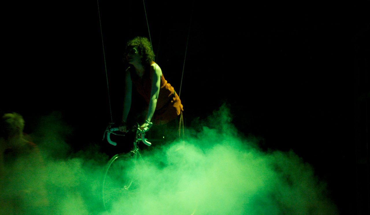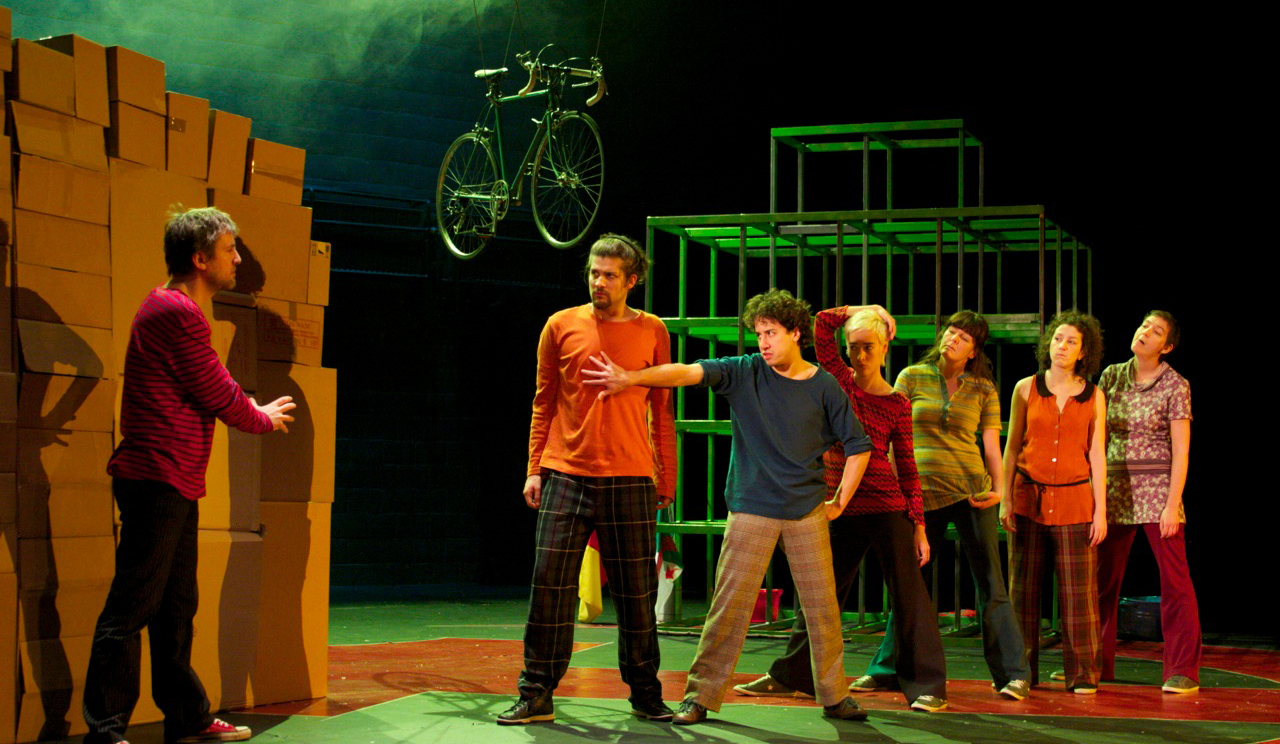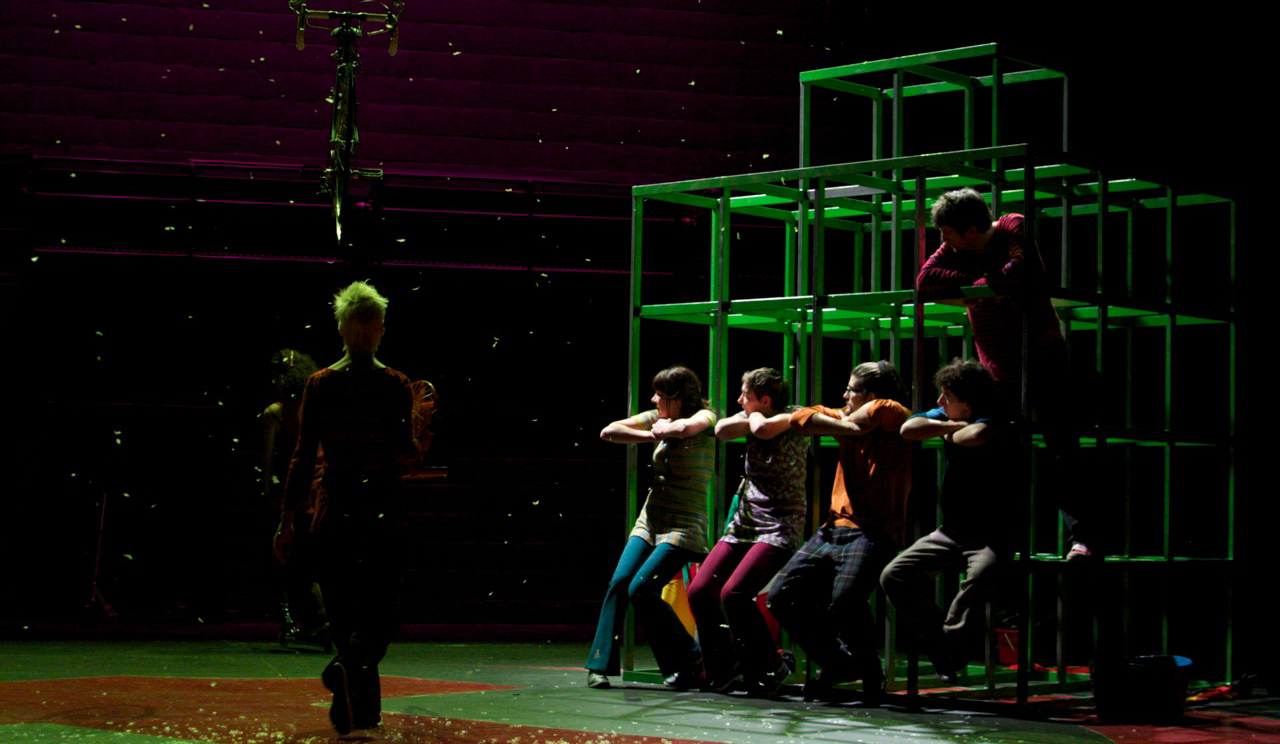 Pour mettre en scène ce conte cruel, Christine Delmotte a choisi de faire littéralement jouer les comédiens dans un décor-terrain de jeux où une cage à écureuils côtoie un vélo dans les airs et une barricade en cartons. Les sept acteurs virevoltent sur leur trottinette, répètent leur haka de guerre, brandissent leurs drapeaux, courent en tous sens avec espièglerie, la personnalité de chacun se dessinant même s’ils incarnent à tour de rôle Amélie. Dans une belle choralité, ils insufflent une vitalité étonnante au spectacle sans temps mort sans oublier la petite dose de perversité et de cruauté qui donne tout son sel à cette histoire de jeux d’enfants.