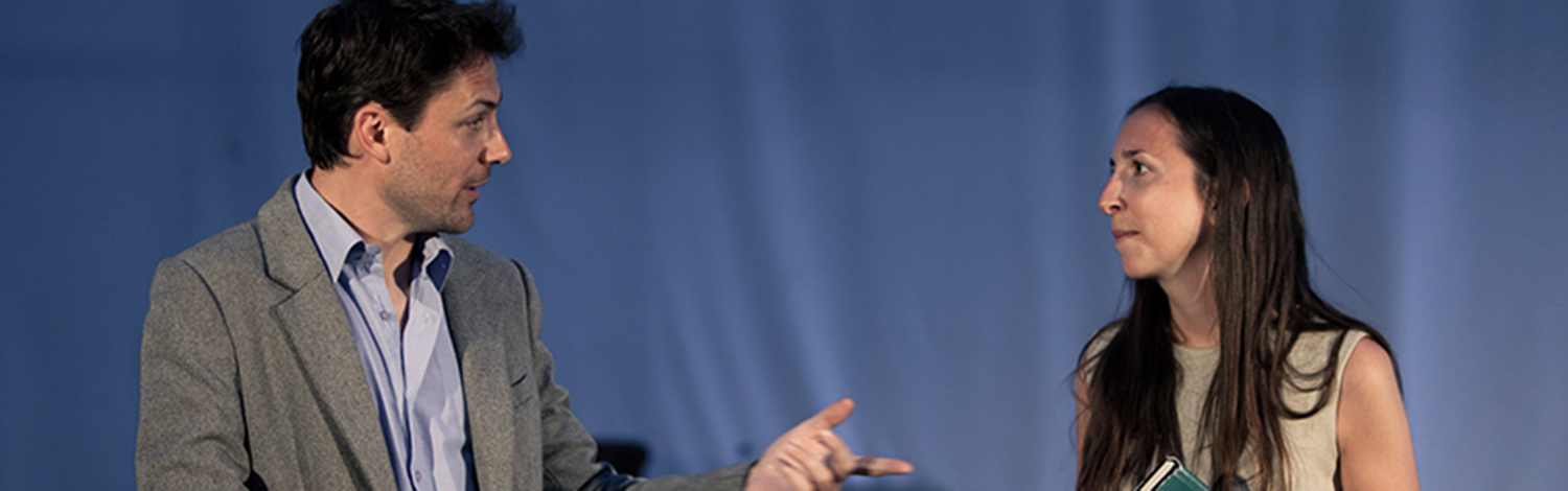 Een man en vrouw staan op scène.
