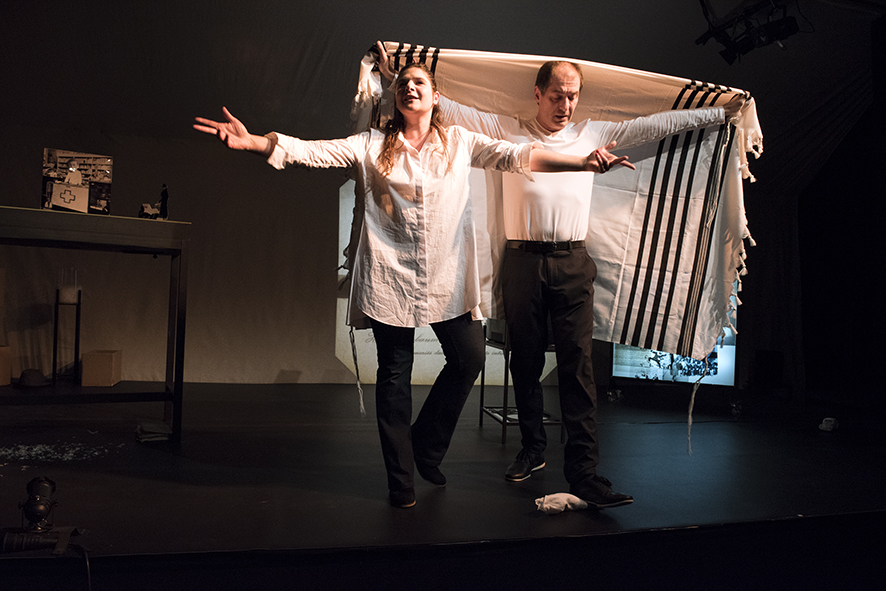 La mise en scène lui permet de mettre en images des documents auxquels le livre fait référence, elle joue avec les sons, mêle ombres chinoises, théâtres d’objets et chants yiddish. Elle mise résolument sur l’interaction avec le public, régulièrement interpellé durant la pièce, à l’image d’une stand-up comedy.