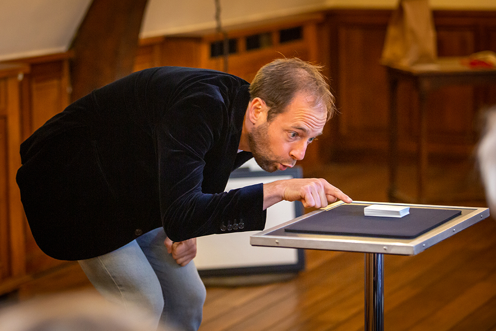 La plupart des magiciens, dont Jack Cooper, se produisent habituellement sur scène, entourés de nombreux effets : musique, lumières, fumigènes, vidéo... Cela participe bien sûr au show. Mais soyons honnêtes, il s'agit bien souvent d'une ceinture de sécurité pour l'artiste. La fumée aurait-elle caché quelque artifice ? Le son camouflerait-il quelque chose qu'il ne faut pas entendre ? Qui sait ? Et de toute façon, seule la magie du show importe. Mais ici, rien de tout cela. De par la proximité, il s’agit pour le magicien d’un vrai saut dans le vide. Il est seul avec vous...