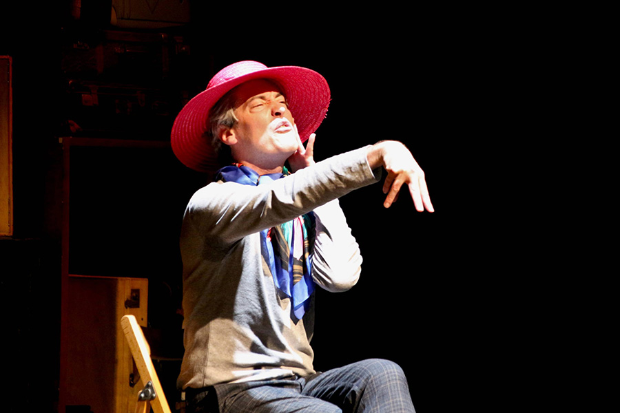 Sur scène, des valises que le comédien ouvre pour interpréter les différents personnages